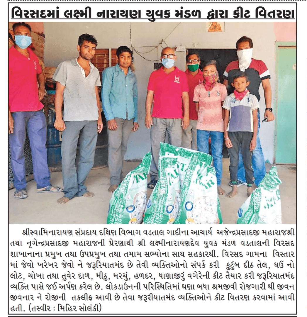 વડતાલ ગાદીના આચાર્ય મહારાજશ્રી ૧૦૦૮ શ્રી અજેન્દ્રપ્રસાદજી મહારાજ શ્રી તથા પૂજ્ય ૧૦૮ શ્રી ભાવિ આચાર્ય શ્રીનૃગેન્દ્રપ્રસાદજી મહારાજશ્રીની પ્રેરણાથી…કોરોના(COVID-19) મહામારી સમયે વિરસદના હરિભક્તો દ્વારા જરૂરિયાતમંદ ગરીબ લોકો માટે અનાજ વિતરણની વ્યવસ્થા કરવામાં આવી રહી છે.